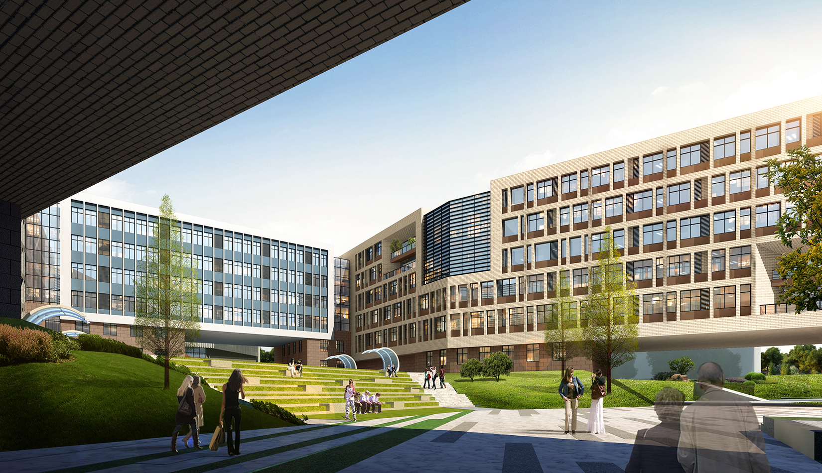 東區(qū)生活區(qū)庭院空間配合建筑設計的現(xiàn)代主義風格,提取未來主義畫派的代表元素——線條 作為構(gòu)思的主脈絡,以“理性與未來”為設計理念,在建筑圍合的景觀中庭采用現(xiàn)代景觀設計,意在未來,情致校園 。
