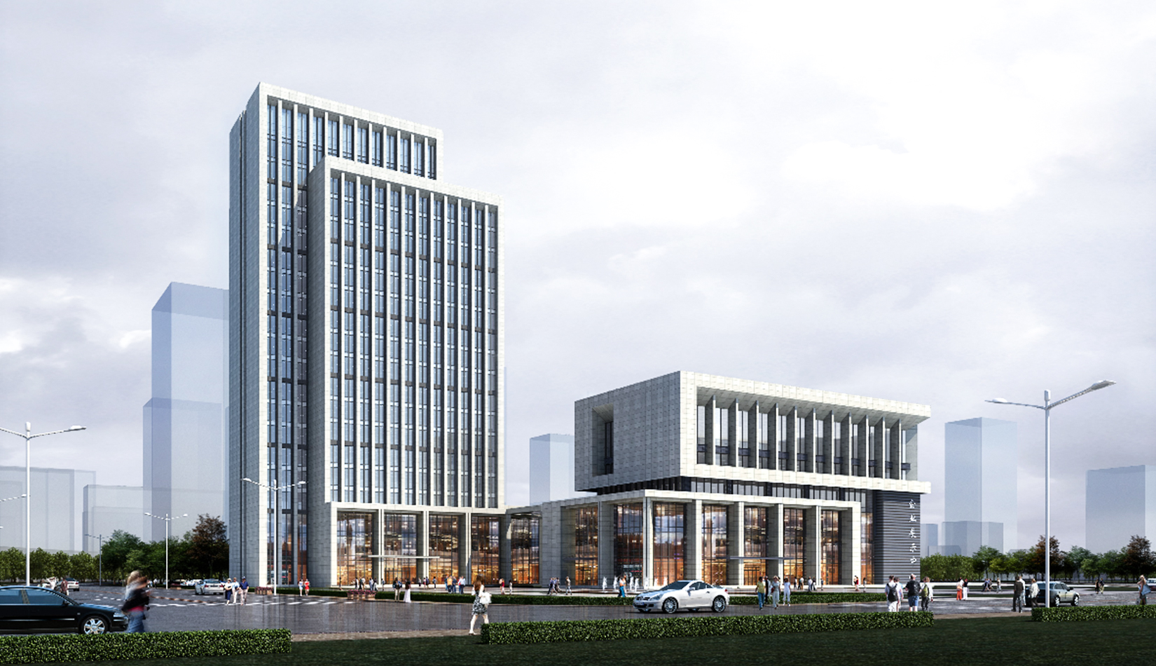 充分利用城市景觀,并形成了自身的樓前集散廣場綠化、沿河休憩景觀,建筑西側(cè)公共景觀廣場綠化三大塊景觀帶,并通過景觀軸將三部分聯(lián)系起來。