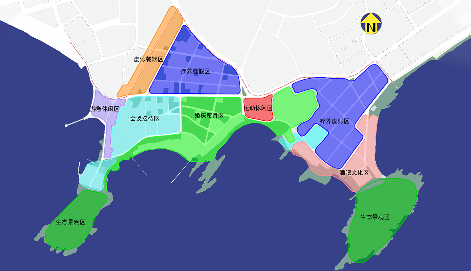 秉持:“整體性積極保護(hù)、減法為主、功能提升、公眾開放”的原則,整飭形成度假餐飲、游憩休閑、會議接待、婚慶蜜月、運動休閑、酒吧文化、療養(yǎng)度假與生態(tài)景觀區(qū)。